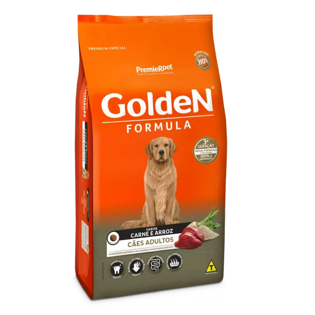 GoldeN Formula Adultos Carne & Arroz é um alimento Premium Especial desenvolvido para cães adultos exigentes. Os cães são essencialmente carnívoros e digerem muito melhor alimentos de origem animal. Dessa forma, GoldeN Formula utiliza proteína de carne bovina e não sabores artificiais e visa, acima de tudo, proporcionar aos cães o nível ideal de todos os nutrientes que eles necessitam para uma vida longa e saudável.